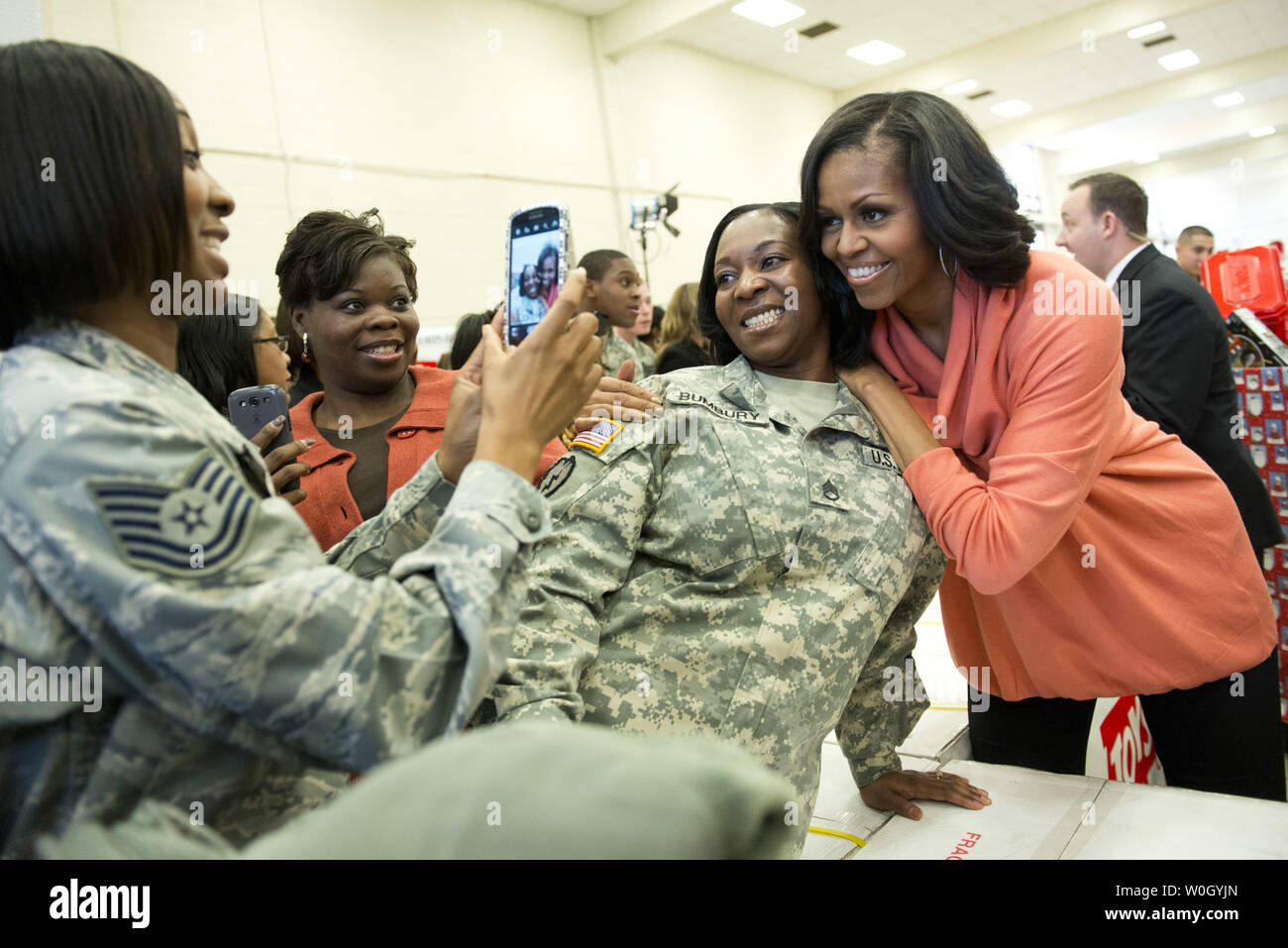 First Lady Michelle Obama Takes A Photo With Army Staff Sergeant Tamla Bumbury As Volunteer Lorri Stinson Watches On During A Toys For Tots Toy Sorting Event At Joint Base Anacostia Bolling In